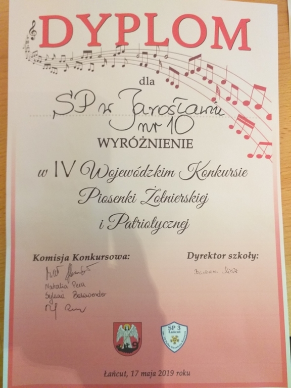 Kolejny sukces uczennic naszej szkoły – 17 maja w SP nr 3 w Łańcucie odbył się IV Wojewódzki Konkurs Piosenki Żołnierskiej i Patriotycznej. W kategorii „Zespoły” nasz duet Weronika Trojanowska i Wiktoria Pelc - wywalczyły Wyróżnienie.